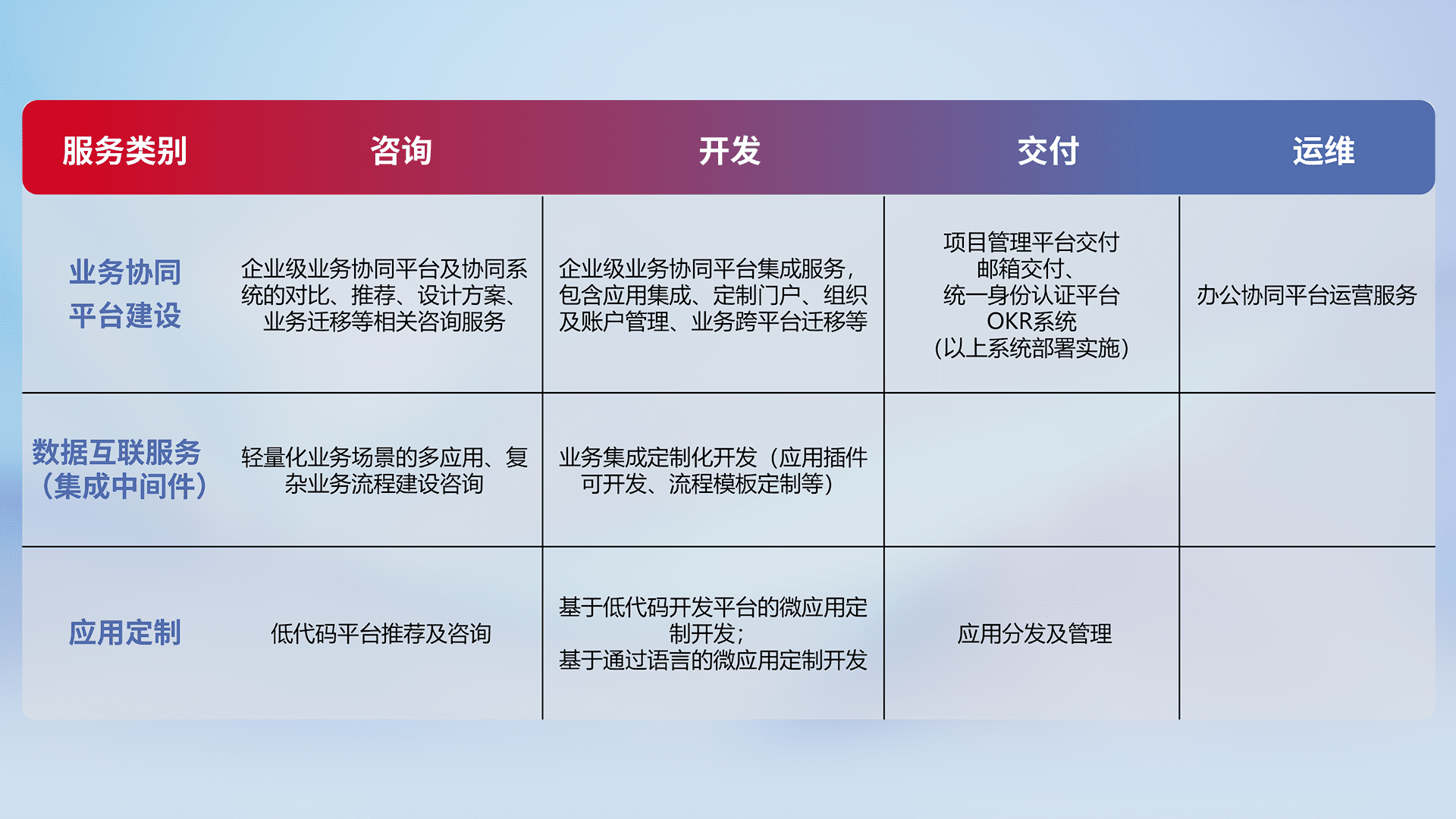 针对钉钉、、企微、、、IDaas等平台级产品提供产品的规划、、、方案、、、、交付、、定制化开发等服务,,,实现如统一协同办公、、、智能客户服务、、、、混合会议管理、、智能数据查询、、等业务场景,,,,实现数字化转型。。